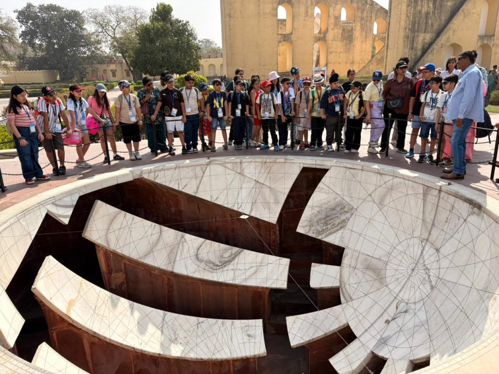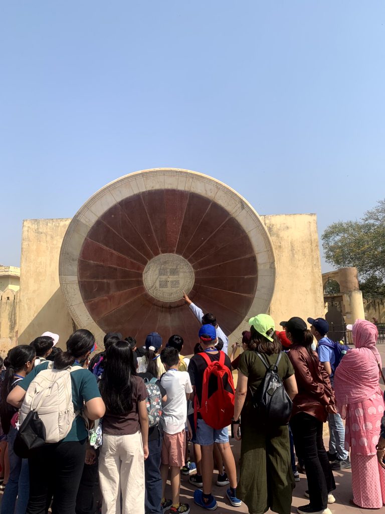 The Jantar Mantar is an extraordinary observatory built by Maharaja Sawai Jai Singh II between 1724 and 1735. He was not only a great ruler but also an astronomer and mathematician who wanted to improve the accuracy of timekeeping and study celestial movements. He built five Jantar Mantars across North India, in cities like Delhi, Varanasi, Ujjain, Mathura, and Jaipur. We learnt that the instruments at Jaipur’s Jantar Mantar can measure time, track stars, and predict astronomical events. We were amazed to see a giant stone sundial at Jantar Mantar, the Samrat Yantra, which stands about 90 feet tall and can tell time with an accuracy of about two seconds.