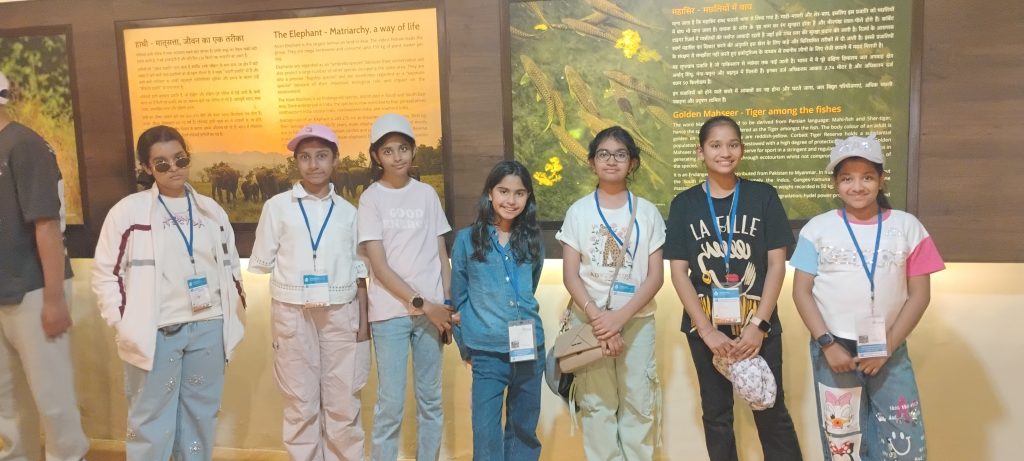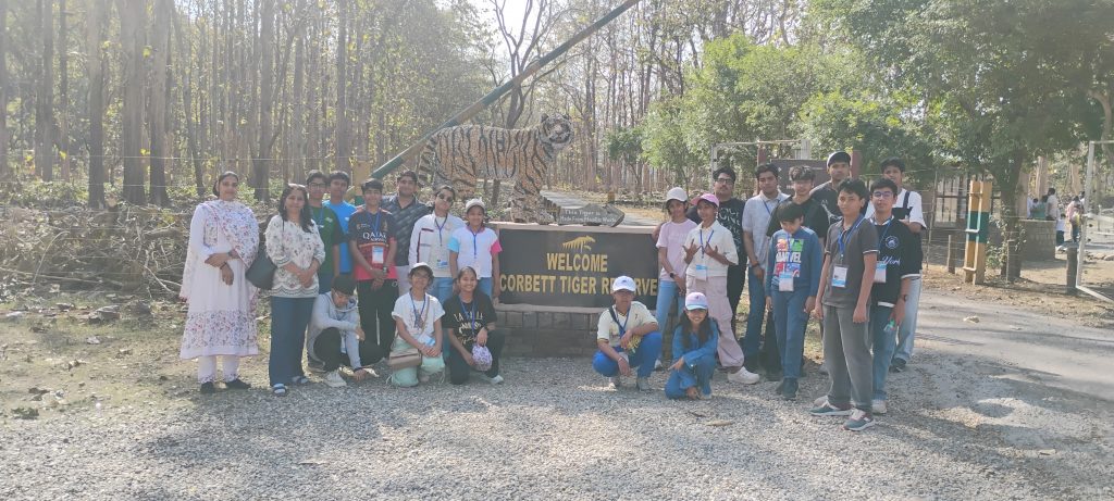 When we arrived in Jim Corbett National Park in the afternoon, we felt relaxed and positive because of the fresh environment. The park had many types of trees, including mango and sandalwood. We visited a large dam built on the Kosi River, which has many tributaries. The river had clear water, and we could see colourful rocks inside it.